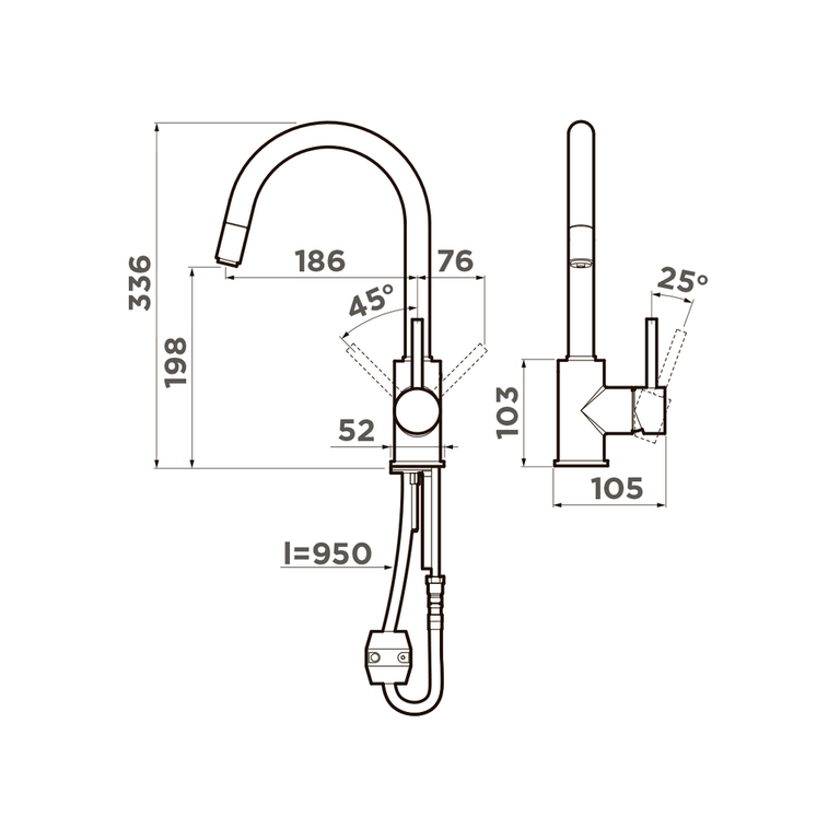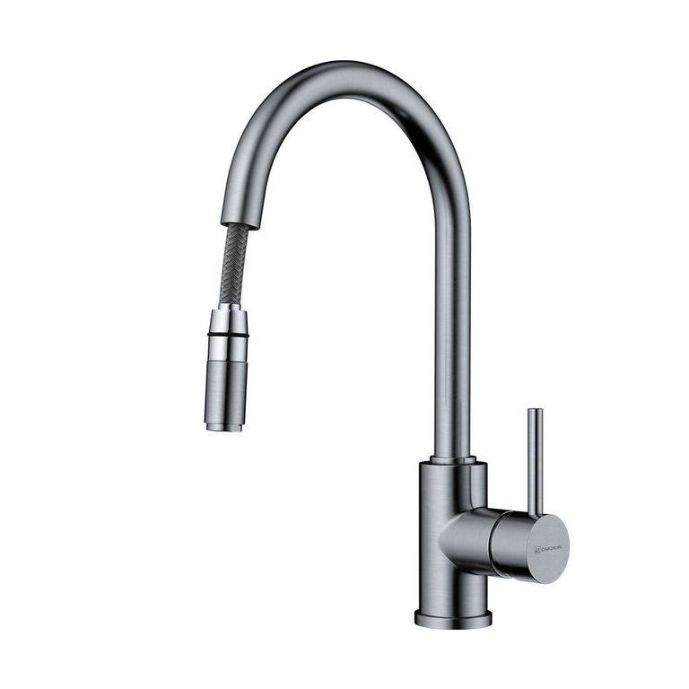 Практичный однорычажный смеситель выполнен в современном стиле и снабжен вытяжным шлангом;