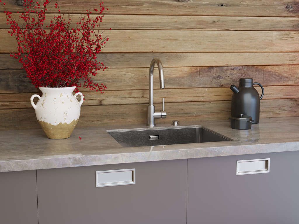 Практичный однорычажный смеситель выполнен в современном стиле и снабжен вытяжным шлангом;