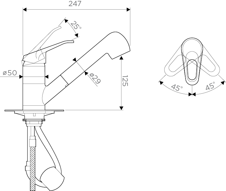 Практичный однорычажный смеситель выполнен в современном стиле и снабжен вытяжным шлангом и функцией переключения воды на 2 режима: струя и душ;