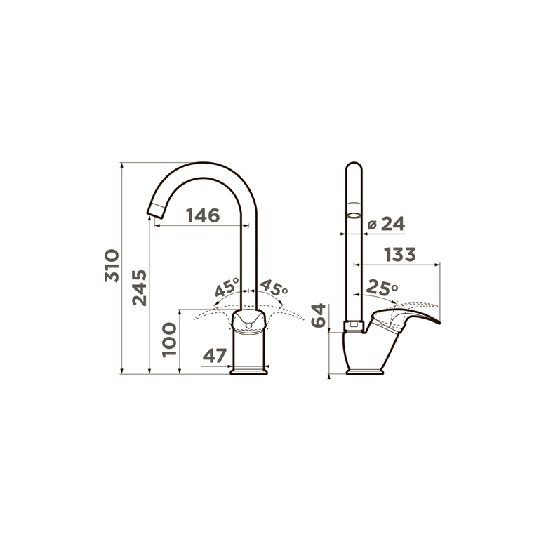 Смеситель выполнен в современном стиле и снабжен высоким поворотным изливом;