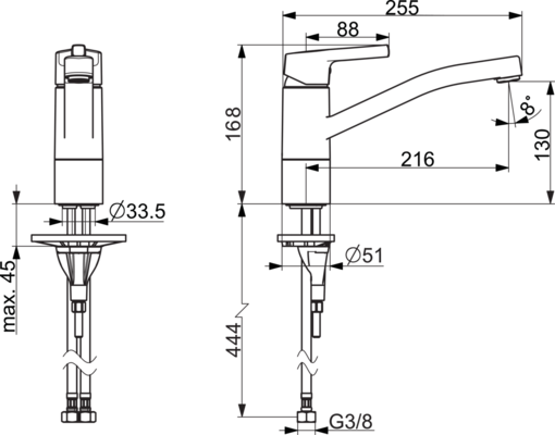 Заводская установка угла поворота излива 120° (может быть ограничен до 40°-80°). Встроенная опция ограничения расхода и температуры воды.