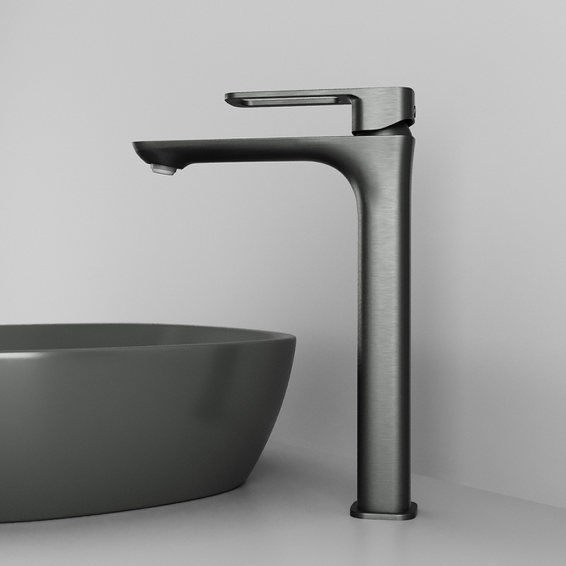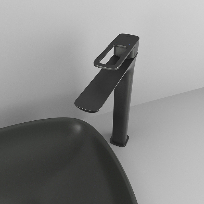Высокий смеситель для настольного умывальника Slide в стильном графитовом цвете отлично дополнит настольный умывальник-чашу. Отверстие-петля на ручке выполняет декоративную и при этом практичную роль — ее легко захватить даже намыленной рукой и отрегулировать напор или температуру. Силиконовый аэратор эстетично скрыт в корпусе излива. В комплекте гибкая подводка и комплект крепежа.