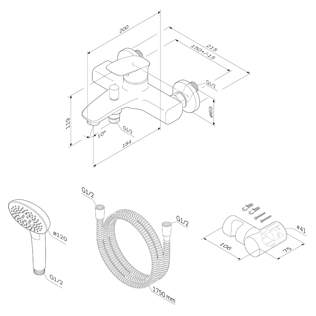 В комплекте душевой набор: стильный ручной душ 120 мм 3 режима, настенный держатель с регулировкой угла наклона, душевой шланг с защитой от скручивания.