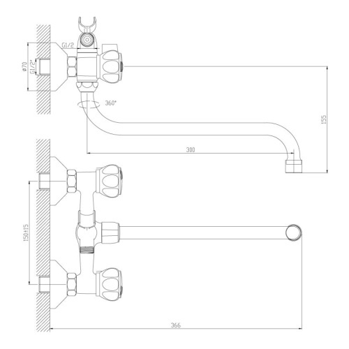 В комплекте: смеситель с эксцентриками, держатель душевой лейки, душевая лейка, душевой шланг.