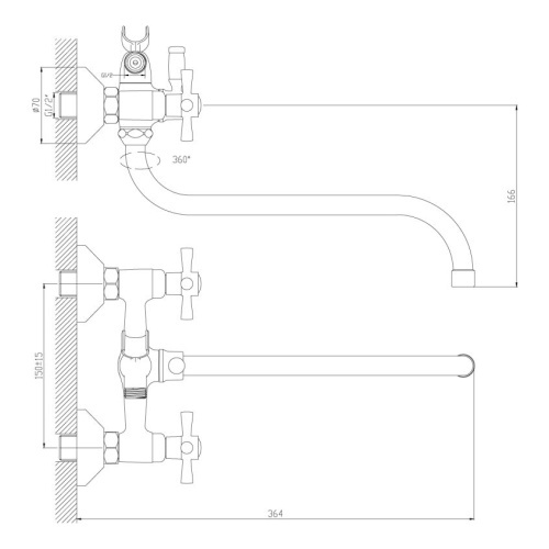 В комплекте: смеситель с эксцентриками, держатель душевой лейки, душевая лейка, душевой шланг.