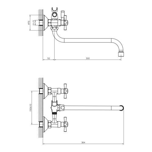 В комплекте: смеситель с эксцентриками, держатель душевой лейки, душевая лейка, душевой шланг.