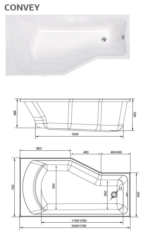 Асиметричная форма ванны Convey 170*75 позволит совместить слив ванны и раковины (раковина размещается над узкой частью ванны), что позволит эргономично обустроить внутреннее пространство ванной комнаты и осовременить ее дизайн.