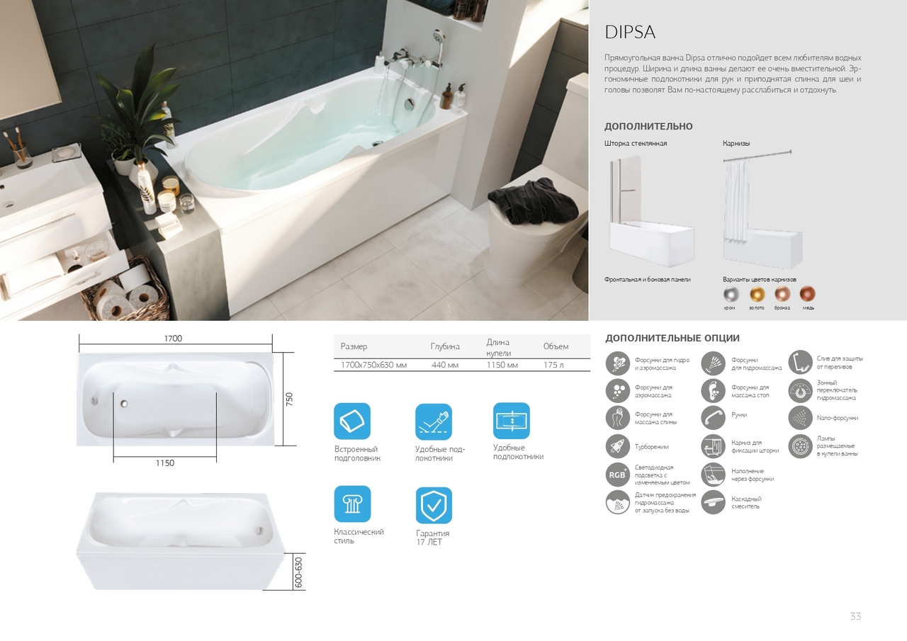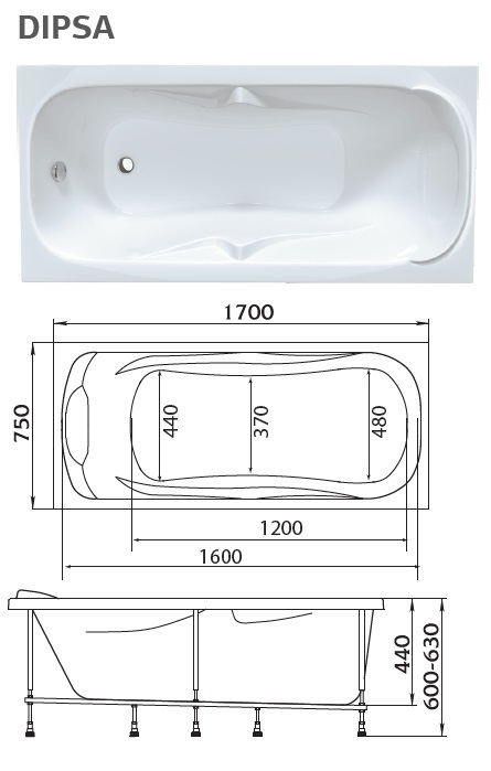 Прямоугольная акриловая ванна Dipsa с габаритами 170*75см отлично подойдет всем любителям водных процедур: в ней вы сможете комфортабельно разместиться.