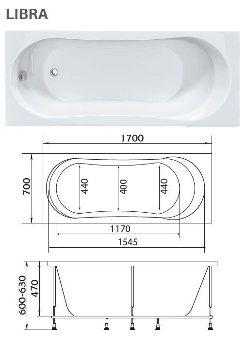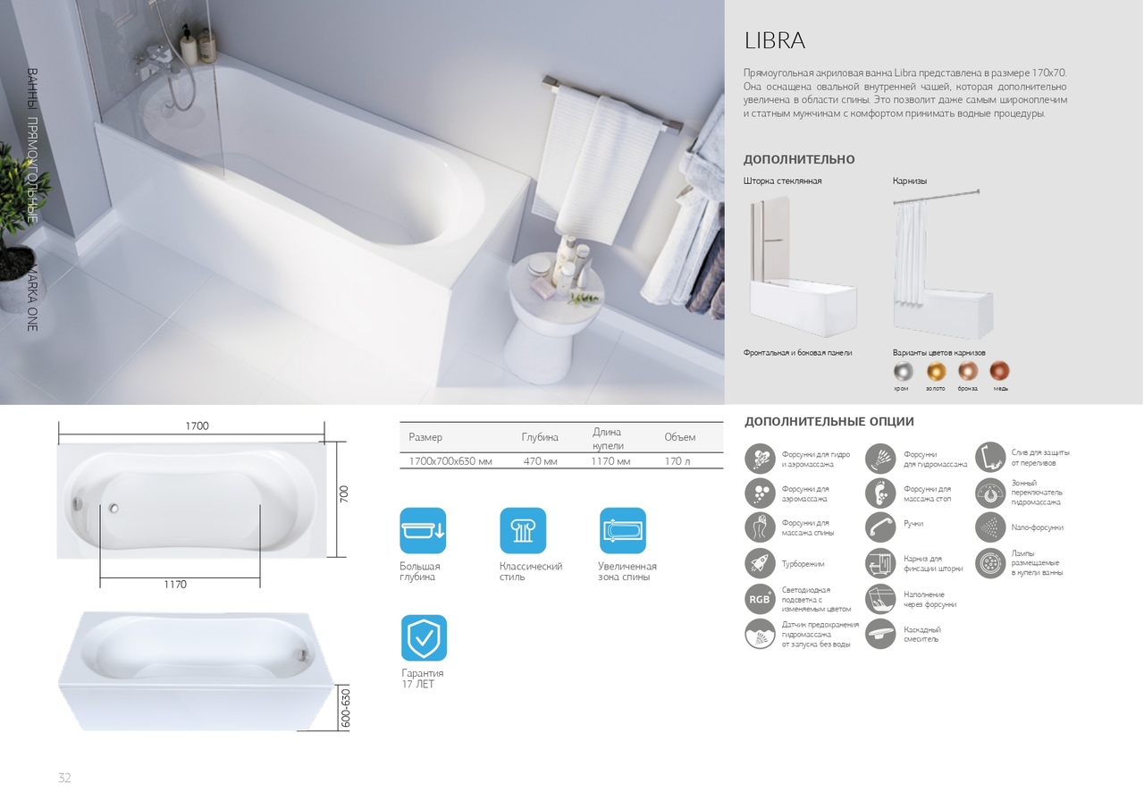 Прямоугольная акриловая ванна Libra представлена в размере 170*70см. Она оснащена овальной внутренней чашей, которая дополнительно увеличена в области спины. Это позволит даже самым широкоплечим и статным мужчинам с комфортом принимать водные процедуры.