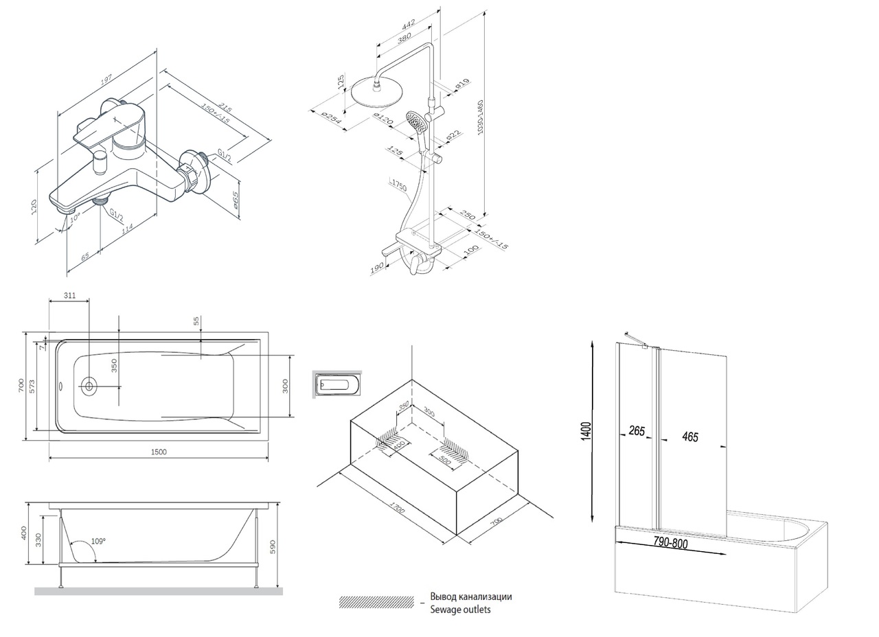 • Шторка на борт ванны с поворотной дверью и фиксированным стеклом.