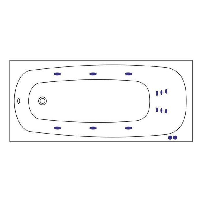 Комплект поставки включает в себя: - Ванна на каркасе, со сливом-переливом; - Гидромассажная система (6 форсунок MIDI-JET); - Массаж спины (6 форсунок MICRO-JET); - Пневматическое управление (пневмокнопка вкл/выкл, регулятор подачи воздуха в систему