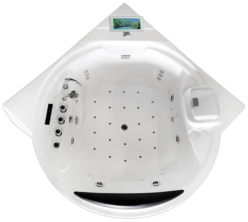 Комплектация: ванна, инструкция, каркас, слив-перелив, аэро- и гидромассажная система, подголовник, холодильник, смеситель с изливом, душевая лейка, съемная фронтальная панель, TV 8", пульт ДУ, радио.