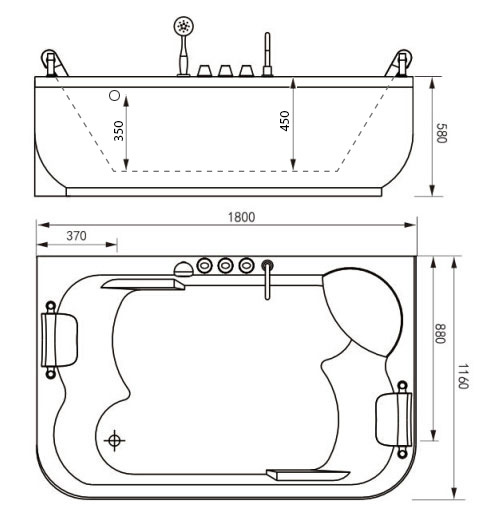 Комплектация: ванна, инструкция, каркас, слив-перелив, аэро- и гидромассажная система, подголовник, смеситель с изливом, душевая лейка, съемная панель, TV 8", пульт ДУ, радио.