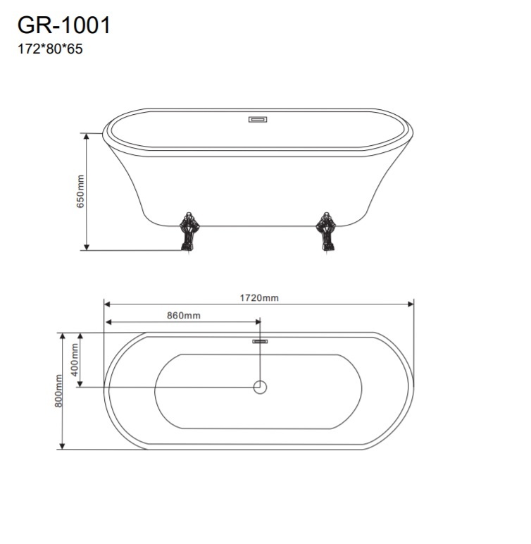 отдельностоящая ванна на ножках (хром) из 100% акрила (толщина 5 мм);