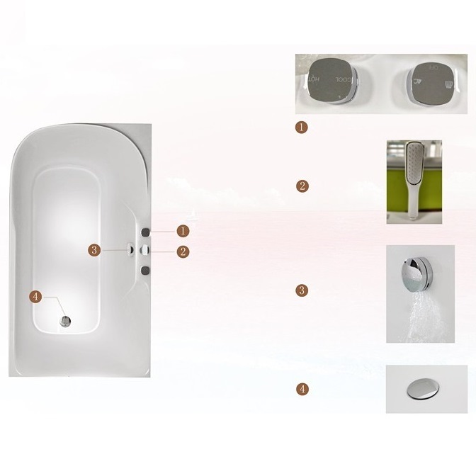Комплектация: угловая ванна без гидромассажа L/R, 100% акрил, армированный по всей площади, бесшовный цельный корпус, большое внутренний объем за счет тонких бортов, интегрированная в корпус полка для аксессуаров, усиленная рама из нерж. стали, регулируемые ножки, слив-перелив, все элементы из хромированного металла. Дополнительные опции: смеситель с керамическими картриджами+ душевая лейка, замена цвета акрила (желтый, черный, красный, оранжевый).