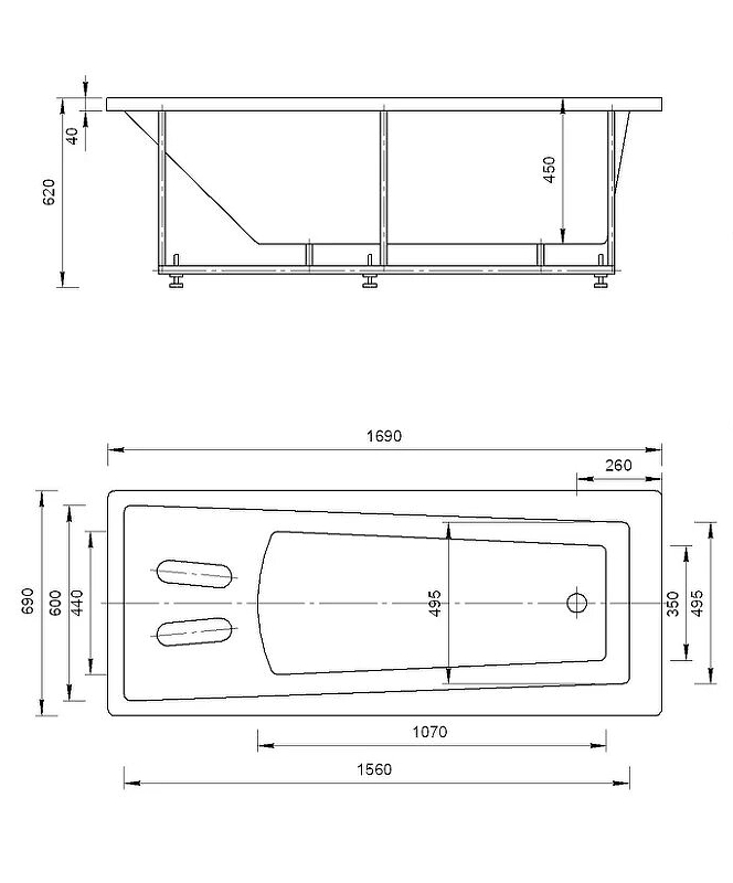 Расположение слива: в ногах (слева).