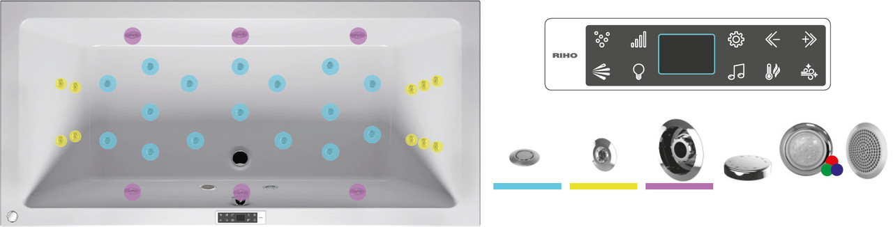 • 11 аэрофорсунок в стандартном исполнении • 1 подводный светильник белого света • однокнопочный электронный пульт