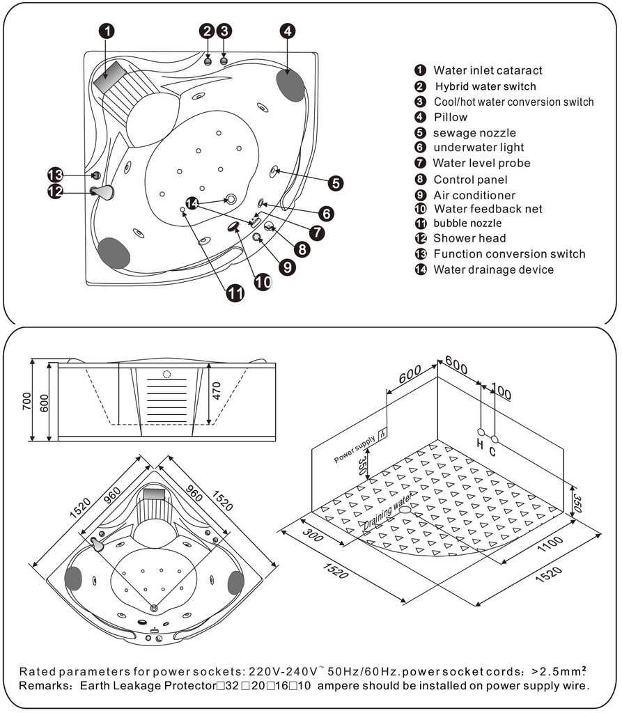 — 100% акрил 5 мм, армированный фиброволокном и дополнительной полировкой внутренней чаши. — Панель управления BH608FN. — Гидромассаж, форсунки: 6 больших боковых. — 8 донных форсунок. — Усиленный каркас из нерж. стали. — слив-перелив из латуни, каскадный налив воды. — Высококачественный латунный смеситель с керамическими картриджами. — Душевая лейка. — Датчик уровня воды. — Защита от протечек. — Система очистки. — Подводная LED-подсветка. — Дополнительные комплектации: панель HP811AF + аэромассаж + озонация + подогрев воды с термостатом. — Панель H168HBBT + ПДУ + FM-Bluetooth + аэромассаж + озонация + подогрев воды с термостатом. — Донные форсунки аэромассажа с LED-подсветкой.