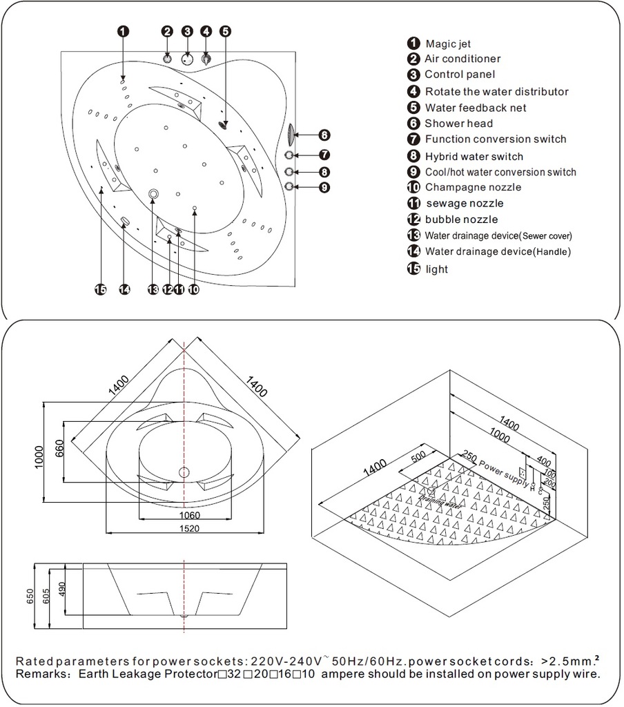 — 100% акрил 5 мм, армированный фиброволокном и дополнительной полировкой внутренней чаши. — Панель управления H631S. — бесшумная система гидромассажа с помпой нового поколения. — Гидромассаж, форсунки: 8 боковых + 8 спинных + 8 в подлокотниках. — Аэромассаж, 8 донных форсунок. — Усиленный каркас из нерж. стали. — слив-перелив и налив воды в одном узле. — Высококачественный латунный смеситель с тремя ручками и керамическими картриджами. — Душевая лейка. — Защита от протечек. — Система очистки. — Подводная LED-подсветка 8 ламп. — Дополнительные комплектации: панель BH608FN - без аэромассажа. — Панель HP811AF + озонация + подогрев воды с термостатом. — 2 подголовника. — Донные форсунки с эффектом "шампанское".