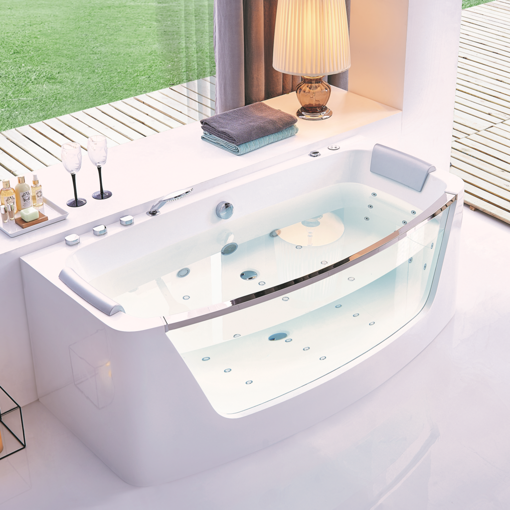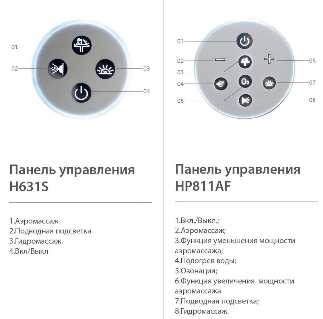 — Большое закаленное травмобезопасное стекло с верхней перекладиной из нерж. стали. — 100% акрил 5 мм, армированный фиброволокном и дополнительной полировкой внутренней чаши. — Панель управления H631S. — бесшумная система гидромассажа с помпой нового поколения. — Гидромассаж, 12 спинных форсунок. — гидро и аэромассаж с эффектом "шампанское" - 9 донных форсунок. — Датчик уровня воды. — Подводная LED-подсветка. — Усиленный каркас из нерж. стали. — слив-перелив с наливом воды в одном узле. — Высококачественный латунный смеситель с тремя ручками и с керамическими картриджами. — Душевая лейка. — Большое внутреннее пространство за счет тонких стенок. — Дополнительные комплектации: подголовник из ППУ. — Панель HP811AF + подогрев воды + озонация. — Панель H168HBBT + ПДУ (управление всеми функциями) + подогрев воды + озонация + радио. — Более подробную информацию по комплектациям можно уточнить у менеджеров.