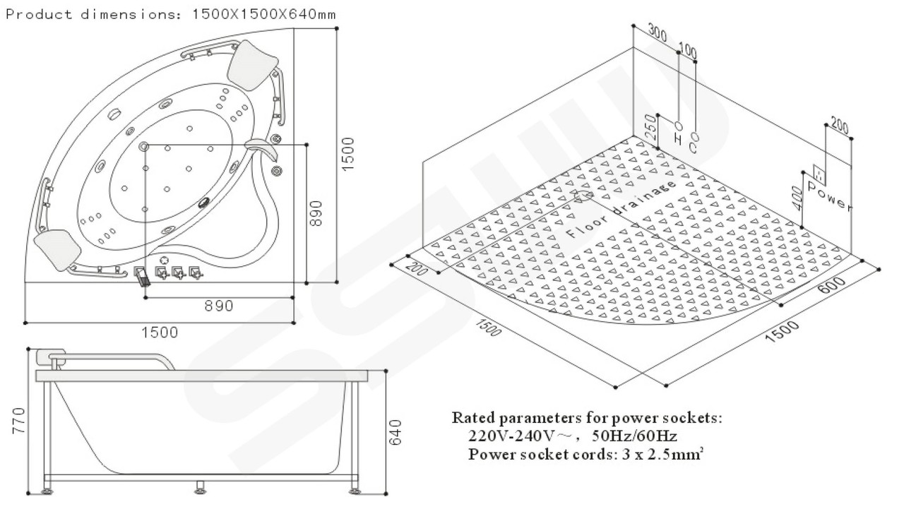 — 100% акрил 5 мм, армированный фиброволокном и дополнительной полировкой внутренней чаши. — Панель управления BH608FN. — Гидромассаж, форсунки: 4 большие боковые + 12 спинных. — 8 донных форсунок. — 8 шейных форсунок в поручнях. — Усиленный каркас из нерж. стали. — слив-перелив из латуни, каскадный налив воды. — Высококачественный латунный смеситель с керамическими картриджами. — Душевая лейка. — Датчик уровня воды. — Защита от протечек. — Система очистки. — Подводная LED-подсветка. — Подголовники из ППУ. — Дополнительные комплектации: панель HP811AF + аэромассаж + озонация + подогрев воды с термостатом. — Панель H168HBBT + ПДУ + FM-Bluetooth + аэромассаж + озонация + подогрев воды с термостатом. — Донные форсунки аэромассажа с LED-подсветкой. — Ароматерапия.
