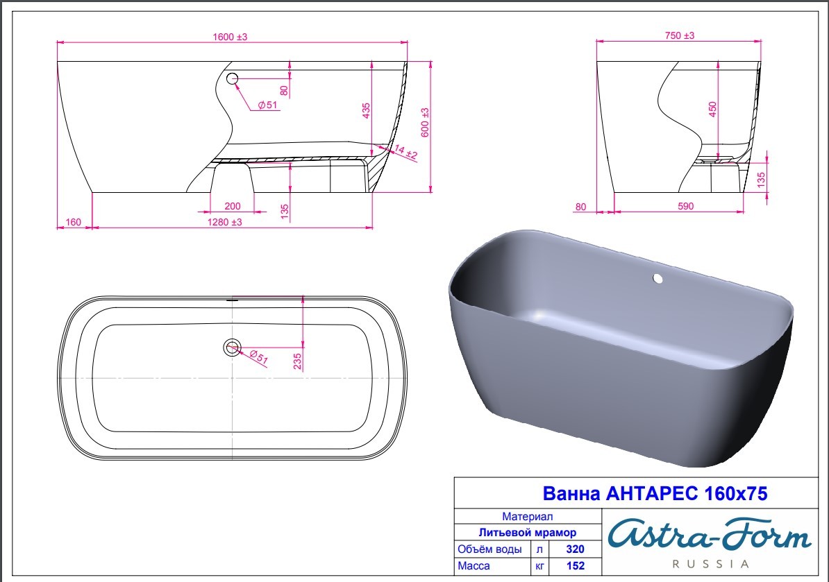 Российская ванна из искусственного камня Астра-Форм Антарес отдельностоящая 160x75 14 базовых цветов - цена 146103 руб. Оформить заказ и купить ванну Астра-Форм Антарес отдельностоящая 160x75 14 базовых цветов в Москве в нашем интернет магазине можно по телефону или добавив товар в корзину 🛒.