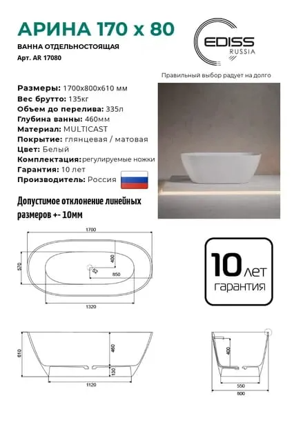 Российская ванна из искусственного камня Ediss Арина 170x80 - цена 79078 руб. Оформить заказ и купить ванну Ediss Арина 170x80 в Москве в нашем интернет магазине можно по телефону или добавив товар в корзину 🛒.