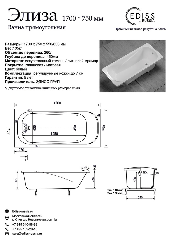 Российская ванна из искусственного камня Ediss Элиза 170x75 - цена 39051 руб. Оформить заказ и купить ванну Ediss Элиза 170x75 в Москве в нашем интернет магазине можно по телефону или добавив товар в корзину 🛒.