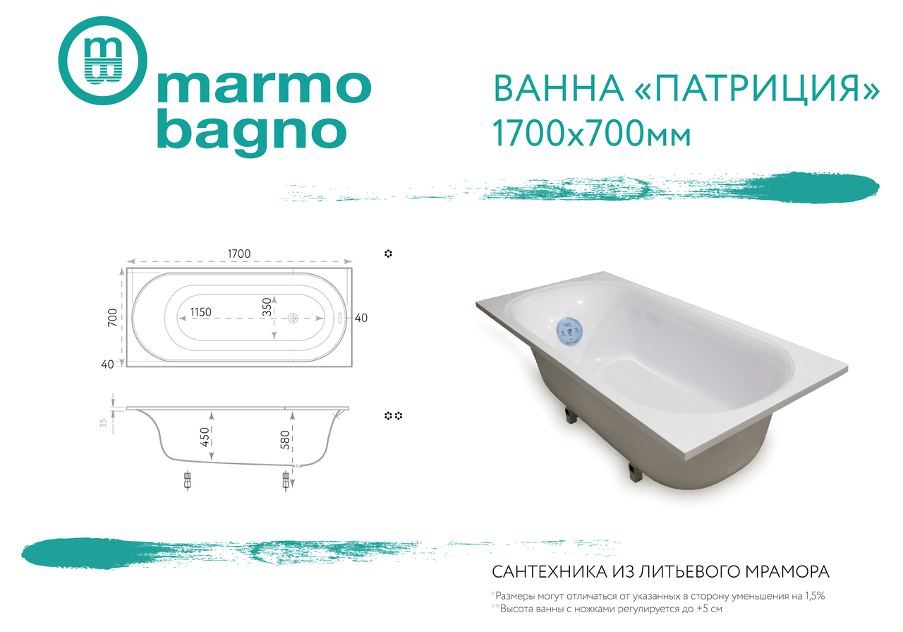 Российская ванна из искусственного камня Marmo Bagno Патриция 170х70 с ножками - цена 50685 руб. Оформить заказ и купить ванну Marmo Bagno Патриция 170х70 с ножками в Москве в нашем интернет магазине можно по телефону или добавив товар в корзину 🛒.