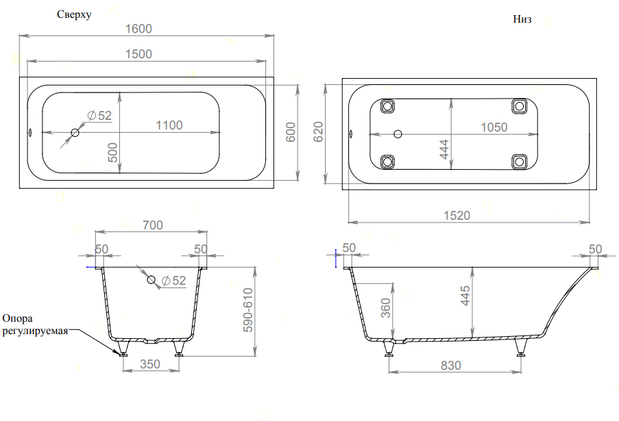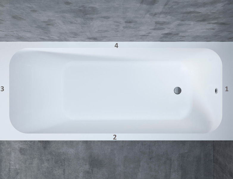 Комплектация: встраиваемая ванна с прямоугольной чашей, регулируемые ножки до 2 см.