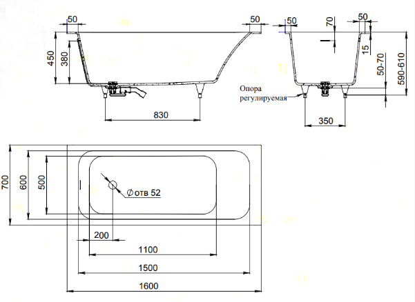 Комплектация: встраиваемая ванна с прямоугольной чашей, регулируемые ножки до 2 см, донный клапан "Up&Down" белый, сифон, интегрированный слив-перелив.