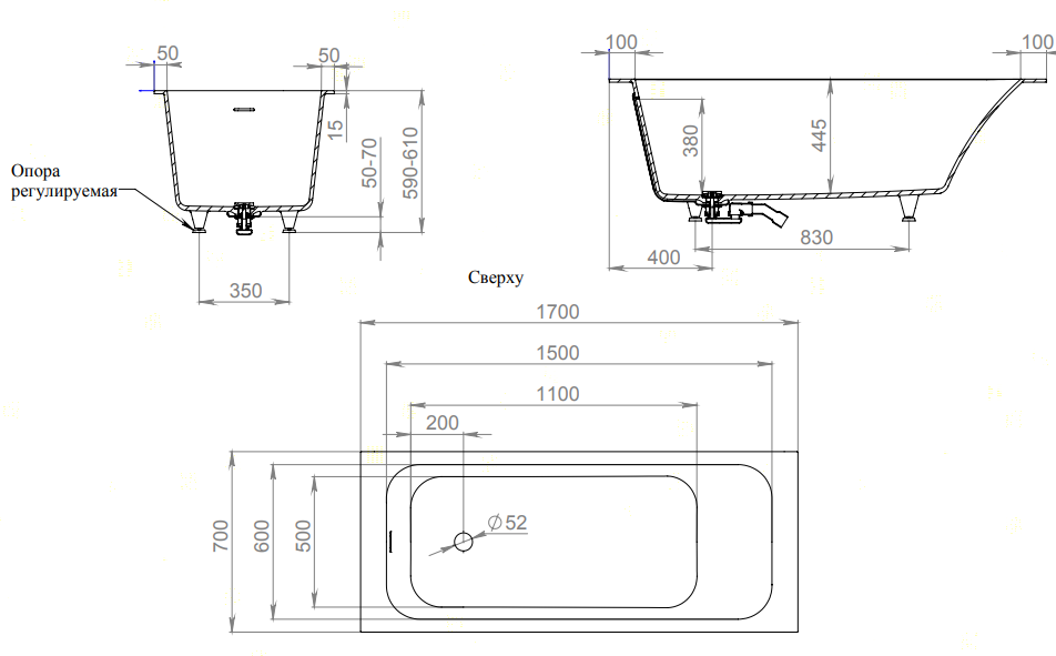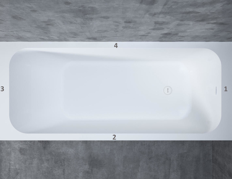 Комплектация: встраиваемая ванна с прямоугольной чашей, регулируемые ножки до 2 см, донный клапан "Up&Down" белый, сифон, интегрированный слив-перелив.