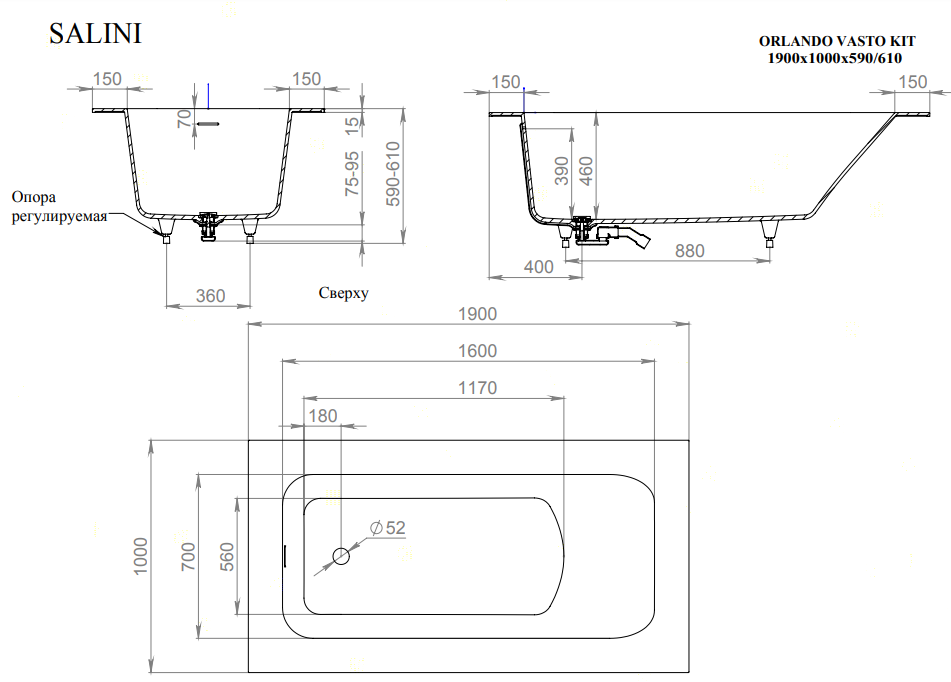 Комплектация: встраиваемая ванна с прямоугольной чашей, регулируемые ножки до 2 см, донный клапан "Up&Down" белый, сифон, интегрированный слив-перелив, ширина бортика от 2 до 15 см.