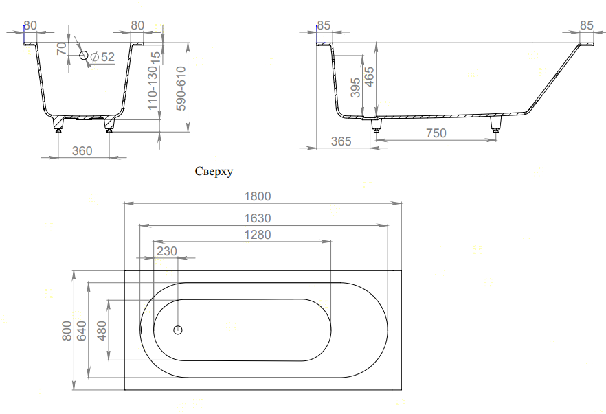 Комплектация: встраиваемая ванна с овальной чашей, регулируемые ножки до 2 см.