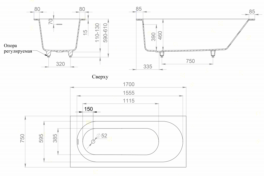 Комплектация: встраиваемая ванна с овальной чашей, регулируемые ножки до 2 см, донный клапан "Up&Down" белый, сифон, интегрированный слив-перелив.