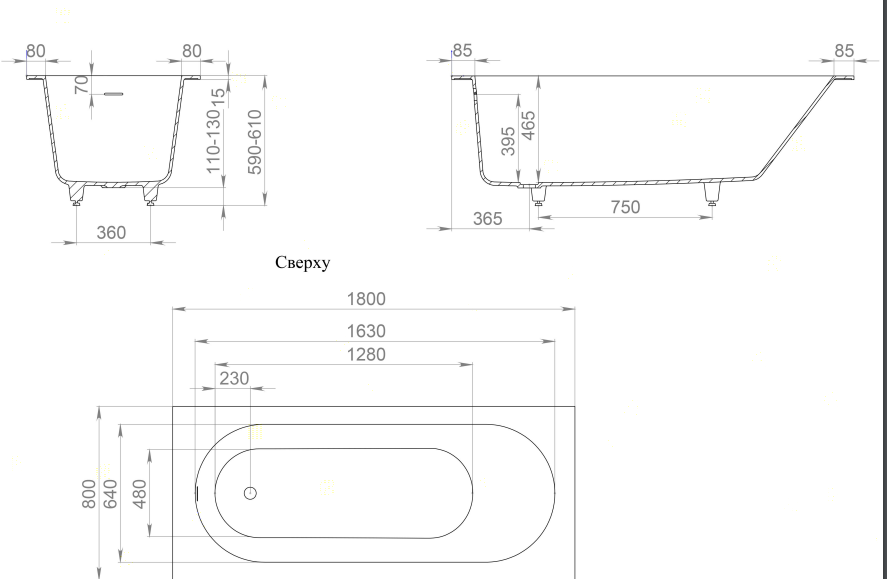 Комплектация: встраиваемая ванна с овальной чашей, регулируемые ножки до 2 см, донный клапан "Up&Down" белый, сифон, интегрированный слив-перелив.