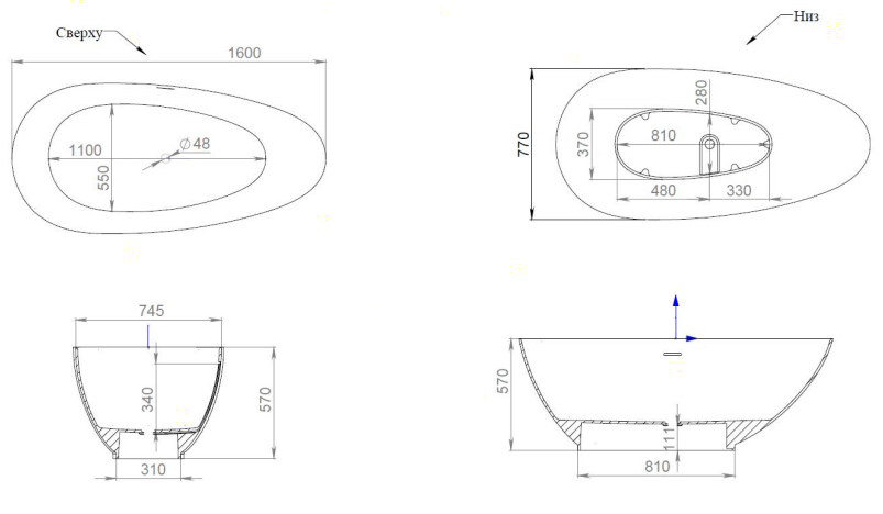Комплектация: ванна, донный клапан "Up&Down" цвет на выбор (белый, хром, золото, бронза), сифон (спрятан в "юбку" ванны), интегрированный слив-перелив.