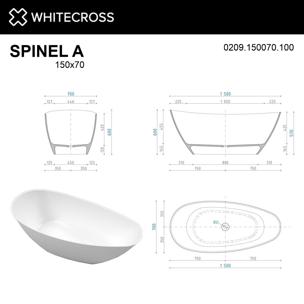 Ванна из искусственного камня WHITECROSS SPINEL A 150x70 белый глянец - 0209.150070.100