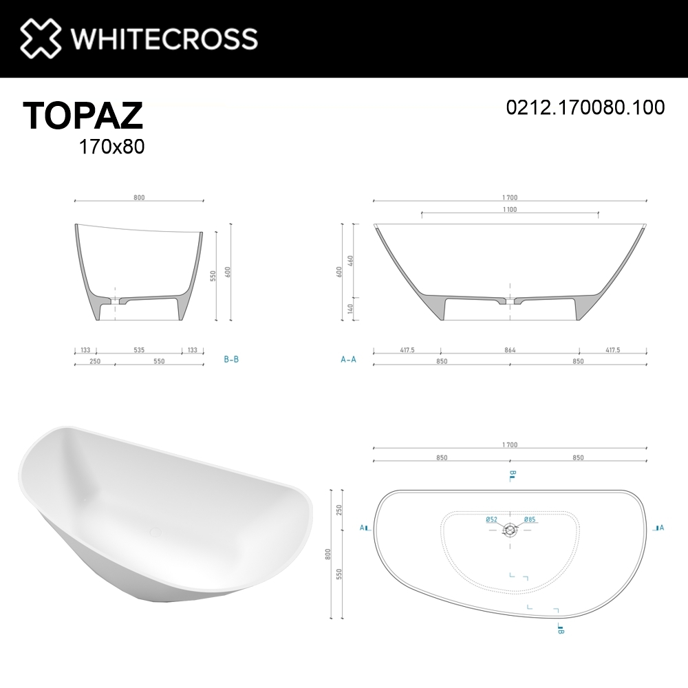 Ванна из искусственного камня WHITECROSS Topaz 170x80 белый матовый - 0212.170080.200