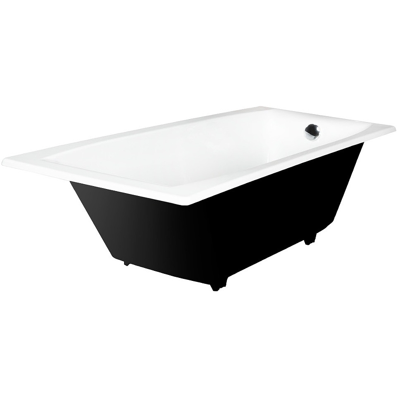 Прямоугольная чугунная ванна. Современный дизайн, глубокая чаша и широкое дно, плоский продольный борт с небольшим сужением в центре.